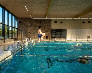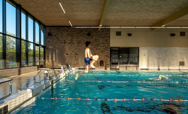 Het zwembad is volledig energieneutraal en uitgerust met de nieuwste duurzame technieken. De verwarming wordt verzorgd door 320 zonnepanelen op het dak en 420 extra panelen in de aangrenzende weide. Warmtepompen voorzien het gebouw, het water en de vloeren van warmte. Voor de zuivering van het zwemwater is geen traditioneel chloor gebruikt, maar een combinatie van een open zandfilter, zoutelektrolyse en ultraviolet licht. Dit garandeert schoner water en een frisse, gezonde zwemlucht.